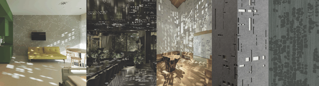 But it’s not always about finding a singular, most fitting dimension—as we consider who we’re designing for and how the space may be programmed, the fractal patterns can be tuned to optimize the experience. Indeed! There are nuances to how we apply science to design so that fractal patterning supports mood, attention restoration, stress recovery or a combination thereof. Consider that the ambiance for a lively bar will naturally be different than for a classy restaurant, but what if you want to be able to shift from offering one experience to another in the same space? An application like this can be found at the Mosh Bar&Dinner in Bucharest designed by INNOCAD and 13&9 Design with consultation from Richard. Backlit ceiling panels patterned with statical fractal perforations can be adjusted to change the fractal dimension of the light patterns in the space thereby shifting the mood from calming to engaging—a clear innovation in biophilic design application and impact potential. Richard’s research has inspired other highly biophilic spaces, products and research.